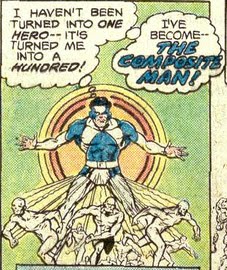 Powers: The Composite Man can shoot tiny, featureless versions of himself out of his crotch and stomach. These are fearless and do not cause pain to the main hero when they are destroyed. CM can "recall" them in an instant, making them disappear from reality.